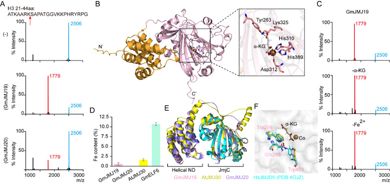 图1. GmJMJ19具有组蛋白H3的内肽酶的活性,且不依赖于Fe2+和α-KG