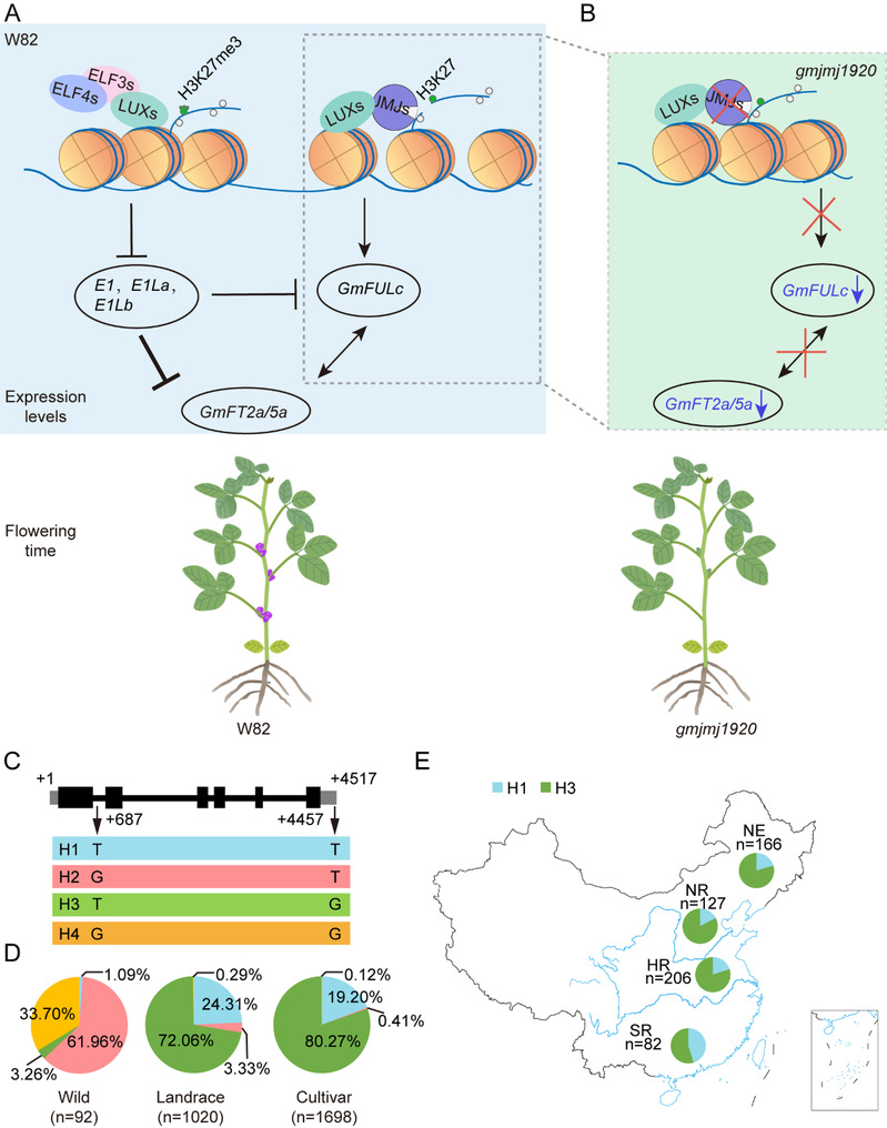 图2. GmJMJ19/20调控大豆开花时间模型图及GmJMJ19参与大豆向我国南方的适应性扩张